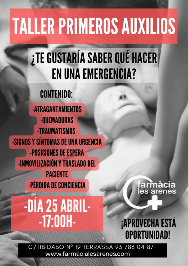 ¿Te gustaría saber cómo actuar ante una situación de emergencia para atender a alguien que se encuentra en peligro? Por desgracia, a veces ocurren accidentes y queremos ayudar, pero no tenemos los conocimientos ni la seguridad para ello...Por ello, te invitamos a que partcipies al TALLER DE PRIMEROS AUXILIOS donde aprenderás como desenvolverte en los siguientes casos: